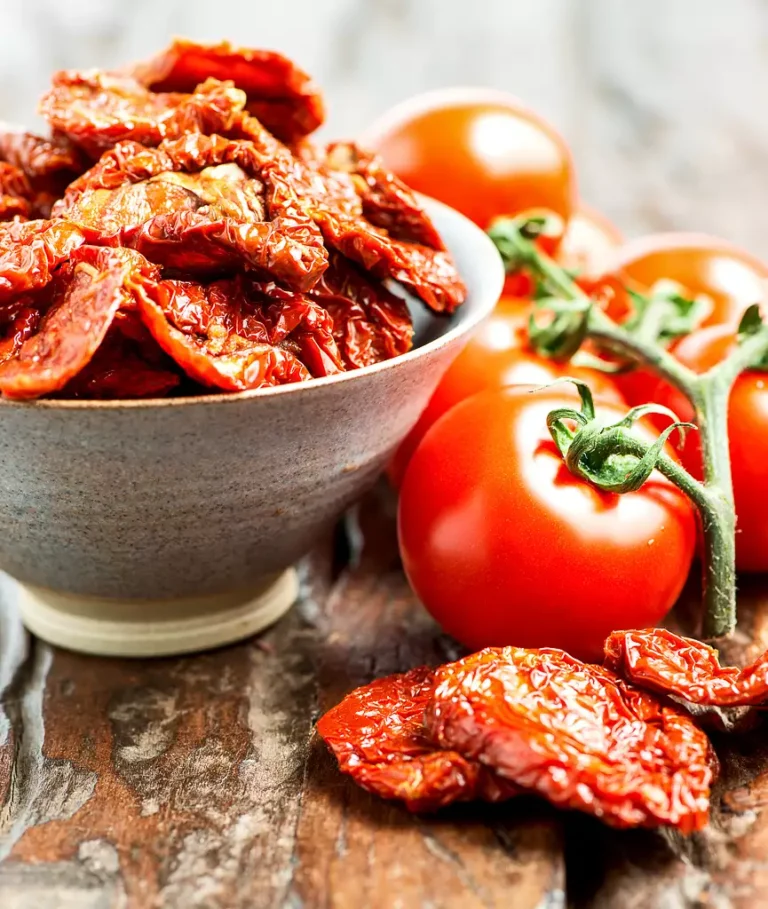Dried tomatoes are rich in vitamins C and A, folic acid or beta-carotene and small amounts of B vitamins including B1, B2, B3, B5.